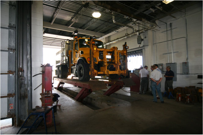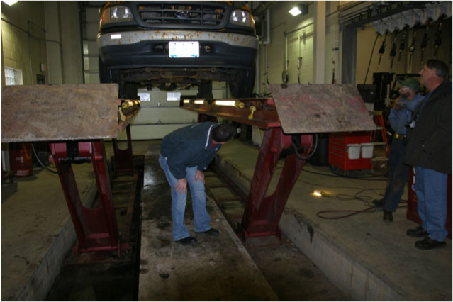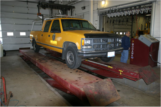 Mohawk’s parallelogram at NYS DOT accommodates small and large trucksUndercarriage track lighting on Parallelogram 50-26 FMohawk’s parallelogram shown at NYS DOT is flush mounted making it “invisible” when not in use to maintain maximum shop floor space.Checking out the full and clear under vehicle access at NYS DOT garage
