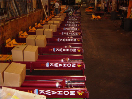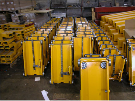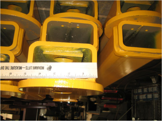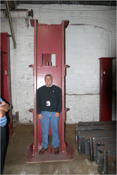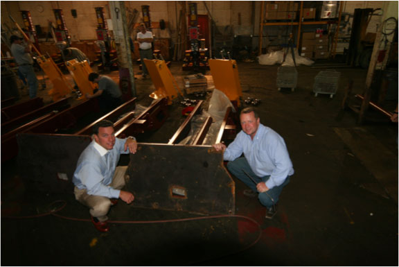 Mohawk Lifts distributors posing next to Mohawk's massive TP-20 base plate in production at the factoryCompleted 2 post carriages ready for assemblyMeasuring A-7 two post swing armsTP-16 two post lifts being prepared for shipmentMohawk's LA distributor stands inside the massive TP-20 column at the factory