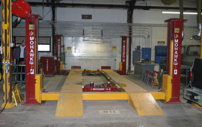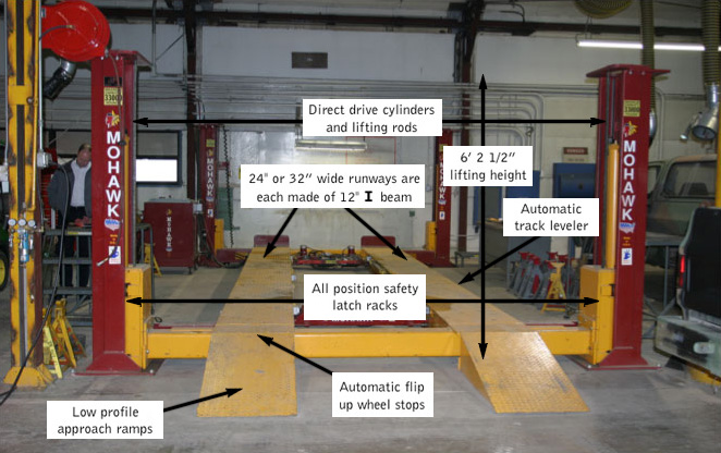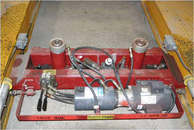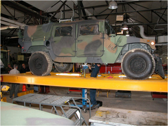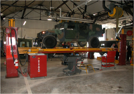 TR-33 at army base shown with adjustable runways to accommodate any vehicle wheelbaseTR-33 4 post lift has heavy duty tracks with 3 parallel 12”wide flange I beamsTR-33 with 6’2 ½” lifting height at US ArmyRJ-25 25,000 lb rolling jack allows wheels free tire and brake service
